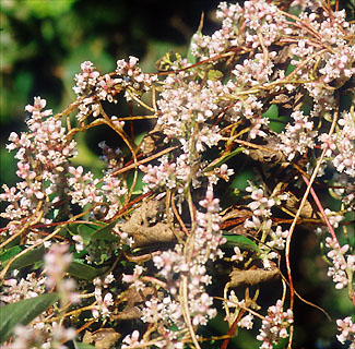 河川敷(かせんしき)のクズ(マメ科)を黄色の「そうめん」が覆っています(写真308)。巻きつかれたクズは、栄養を吸い取られて緑を失いかけています。この寄生植物はヒルガオ科、北米原産の1年草で、海岸部から次第に内陸部へと広がっているようです。