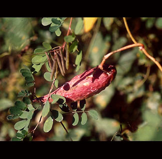 コマツナギなどが見えるブッシュで、サツマイモそっくりの姿、形をしたガガイモの袋果(たいか)が柄の先についていました(写真312)。葉はハート形で、柄や茎ともに、ちぎると牛乳のような汁を出します。