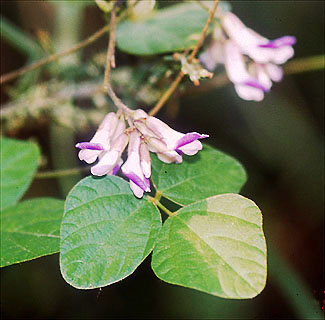 マメ科1年草、右巻きのつる植物です(写真313)。3枚ひと組の複葉で、花は薄い紫色です。地下には閉鎖花(へいさか)をつけるそうです。