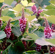 屑(くず)ではなく、良質のでんぷんがとれる葛(くず)で、秋の七草のひとつです(写真314)。葉は3枚ひと組の複葉で、マメ科の多年草のつる植物です。その種子はアメリカや中国の乾燥地の緑化のために役立ちました。しかし、よく増えすぎて困っているところもあるといいます。
