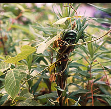 クスの高い木とヒラドツツジの低木を組み合わせた植え込みの中からよじ登ってきたキカラスウリ。他物には巻きひげでまといつきます。雌雄の花は別々の株につきます。雌花は白い花びらが5つに深くさけ、その先は白い髪の毛のように伸びています。ですから、これは雌株の方です(写真305)。花は夕方から咲き、あくる朝にしぼみます。花粉はスズメガなど夜行性のガが運びます。