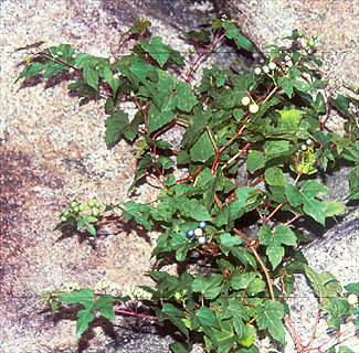フドウ科のつる植物で多年性です(写真318)。葉と向かい合って巻きひげを出し、他物に引っ掛けます。花は夏、これも葉と向き合ってつけます。実は緑白色から青、藍などに変わります。