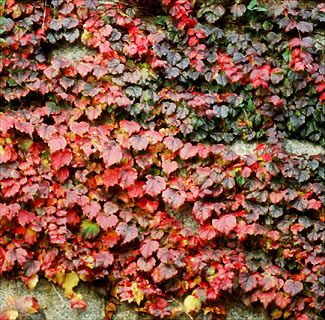 ブドウ科のつる植物で、冬は葉を落としていますから、ナツヅタともいいます(写真319)。ヤブガラシやノブドウと同じく、葉と対生に巻きひげを出します。ひげの先はタコのように吸盤(きゅうばん)になり、他物にくっつきます。