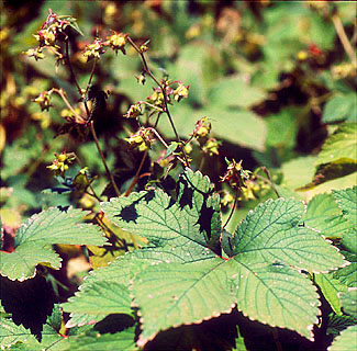 茎や葉柄にとげがあり、葉には粗い毛があって、全草がざらつきます。葉は5〜7に深く裂けています。雌雄の花は別々の株につく雌雄異株(しゆういしゅ)です。