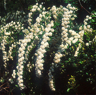 スイカズラ科。街路の低木では一番多く植えられています。白い筒状の花は暖期に咲き、とても長く咲いています。(写真437)。