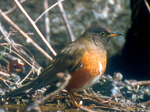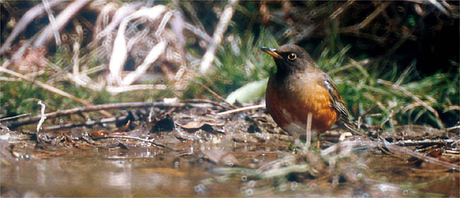 オレンジ色の腹部に白い部分があります.マミチャジナイというよく似た鳥がいますが,これは目の上に,はっきりとした,まゆのような白い部分があるので,区別できます.