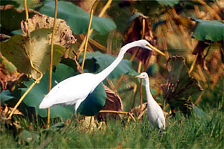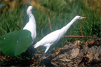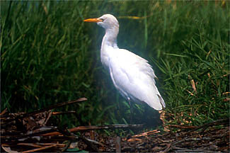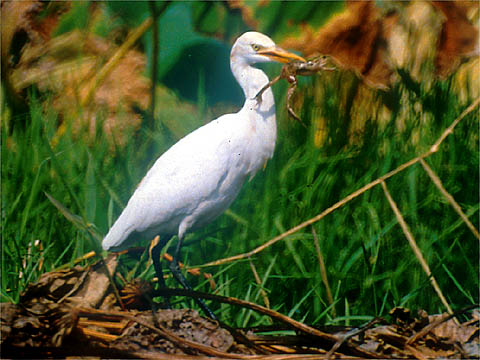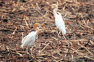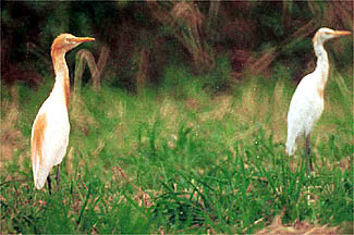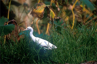 だいだい色の羽が見られればアマサギと考えて間違いありません.全体が白いものもいますが,それでも,後頭部にわずかにだいだい色の毛がついていることが多いです. |