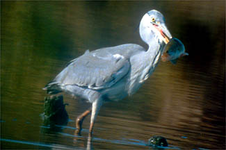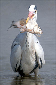 オオクチバスをくわえたアオサギの若鳥