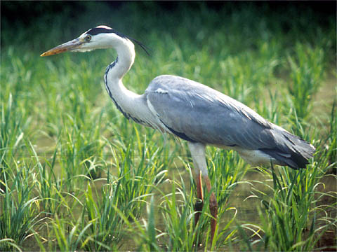 日本産のサギの中では最大の種類です.コサギやチュウサギがからだが白いのに対し,アオサギは翼の部分を中心に青灰色をしています.独特の体型と色で,見間違うことはないでしょう.若いうちは全体がくすんだ感じに見えますが成鳥になるとはっきりとしたもようが出ます.ツルと間違える人がいますが,アオサギは飛ぶときに首をSの字状に曲げて飛びます. |