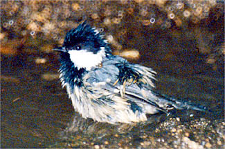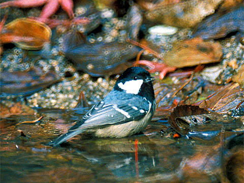 シジュウカラに似ていますが,胸の部分の黒いところが腹の方に伸びません.シジュウカラはここが伸びてネクタイをしているように見えます.