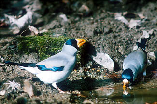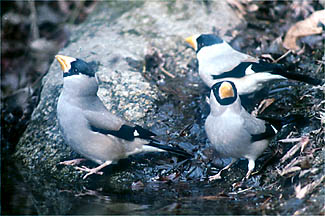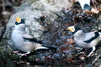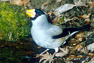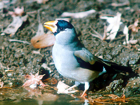 アトリ科の中では大きい鳥です.くちばしが黄色く全体が灰かっ色をしています.顔面上部とつばさは青みを帯びた黒です.
