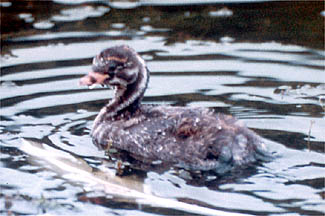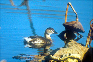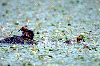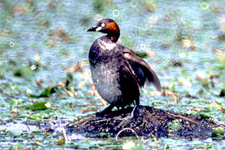 | 明石市大久保町(1996.7.29;下二枚):ヒシが一面を埋めつくしている.水面東よりカイツブリの営巣を9時ころに見つけた.約30m離れていて撮影には遠いが,これでも池岸からはいちばん近いところである.11時ころから撮影者に警戒し,卵を隠すために,つがいでヒシの葉や茎を巣の上に置きだした.白い卵のごく一部が見えていたが,それも見えなくなった.卵が白いということは抱卵期の初期であろう.卵の温度を下げるために,親鳥たちは巣の縁に外向きに立ち,翼を小さくうち振り,風を送っていた. |