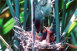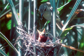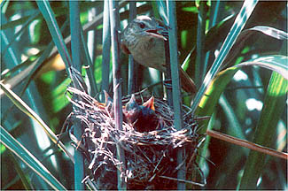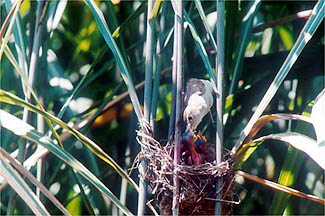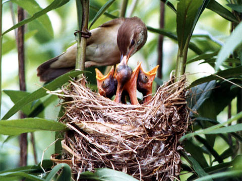神戸では夏鳥として春から秋まで見ることができます.水辺のヨシ原に生息し,写真のような巣をかけます.ヨシの中で「ギョッシ,ギョッシ」と鳴くのが聞けます.