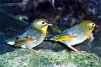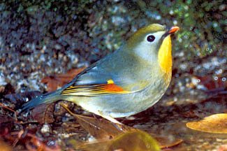 見たとおりの派手な色彩で,赤いくちばしにのどがあざやかな黄色です.