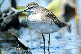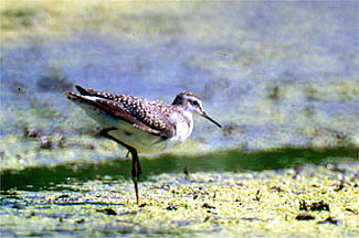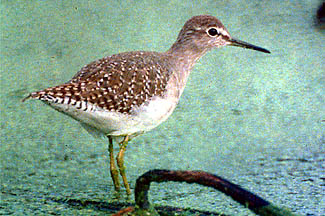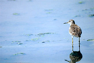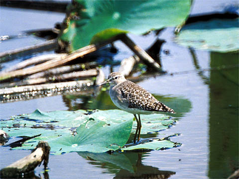 シギとしては小形の方で,目の上のマユ状の白い部分がはっきりとしています.背中の白い点々はキルト地の糸のようにも見えます.