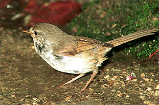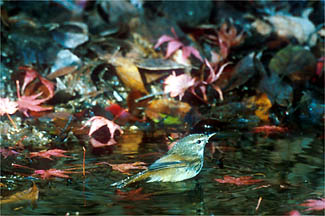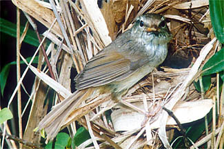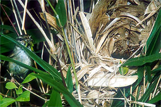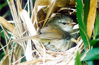 | 神戸市北区(1998.6.20;上5枚):もと棚田であったところが廃田となって雑草やかん木が生い茂り始めたような環境.ウグイスの営巣場所は,こんな中にあった.観察は午前7時30分から午後2時まで.給餌の間隔は14,5分に1回程度.先日来たときは親鳥はあまり警戒しなかったが,今日は巣の裏側でちょっとちゅうちょしながら給餌に来ていたのに気付いた.ヒナは5羽で,親が給餌に返ってくると,大きく頭を持ち上げてエサを受け取ろうとした. |