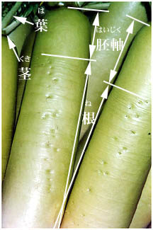 - ダイコンの部分には小さなくぼみが1列にならんでいるのが見られますが、これがある部分が根で、ない部分が胚軸です。茎はとても短くすぐ葉がついています。
