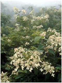 [霧の中のノリウツギ、峯山、1987.7.18.]