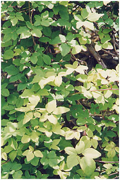3枚の小葉をつける。葉の縁は凸凹し、波打つ。