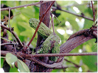 葉を食いあらすのは、アケビコノハというガの幼虫です。