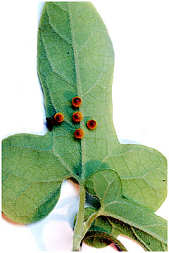 - アリマウマノスズクサの新芽の先端部から3,4枚目の葉に卵を産み付けます。