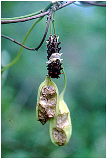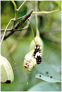 ジャコウアゲハの幼虫は、花、そして実を食べます。