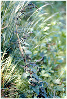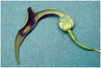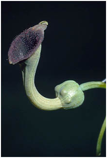 ウマノスズクサは各地に生えています。アリマウマノスズクサにくらべて、花は舷部(げんぶ)と筒部(とうぶ)の区切りがありません。筒部は細く長いです。