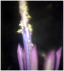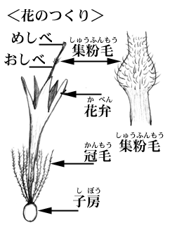 - 花柱の中ほどに球状のふくらみがあり毛が生えています(集粉毛)。