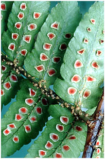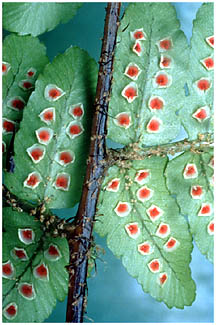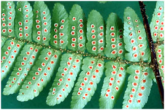 小羽片の縁と軸の中間につきます。
