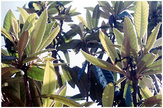 (2) 長だ円形の、大型(長さ15−20cm)で質の厚い葉です。