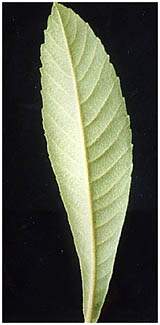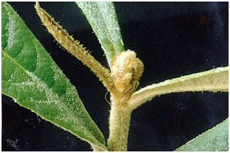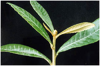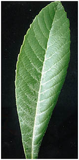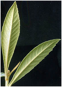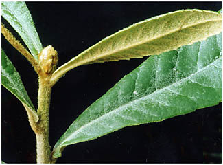 (5) 葉の裏には淡褐色の毛がつきます(上左の写真)。表は最初は毛がつきますがやがてなくなります。毛は葉だけでなく若い枝にもつきます。