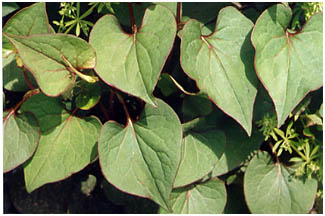 - 葉は茎に互生してつき、ハート型で先はとがっています。青みのある暗い緑色、裏は濁った赤色で、葉の縁や脈が赤くなることがあります。