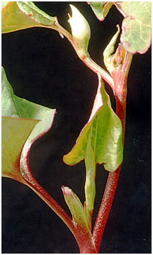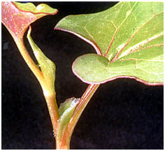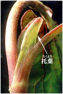 - 葉柄の基部に托葉があります。托葉は合わさって新しい茎を包みます。