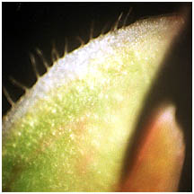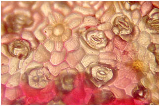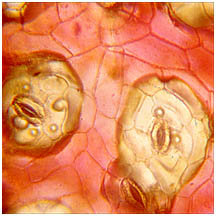 - 葉の裏の気孔をのぞいて見ました。気孔周辺の細胞は特異なものでした。顕微鏡で見てみましょう。レンズ状に盛り上がっています。