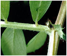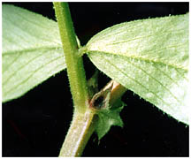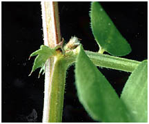 小さな耳形の托葉にみつせんがあり、みつを出します。どうして花以外のところからみつを出すのでしょう。