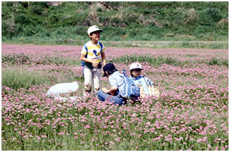 [めずらしくなったレンゲ畑(田)、2002.3.16.]