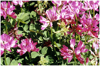 道ばた、公園や野原に生えています。白や赤のチョウ形の花がかたまって咲きます。クローバーとも呼ばれることがあります。