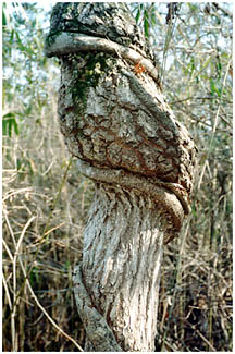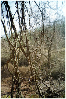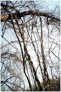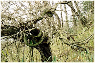 - 里山などで、人の手の加わらないところではフジのつるはのび放題でからみついた木を枯らせています。