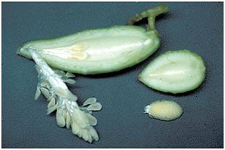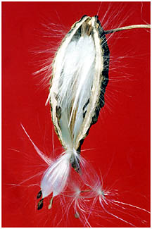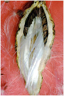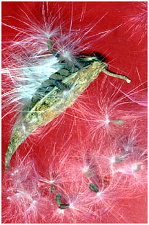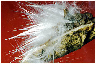 果実が裂開し、中から絹糸状の白い毛をつけた扁平な種子が出てきます。