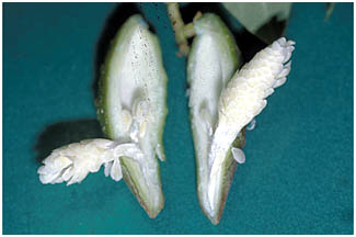 果実は長さ10cmと大きく、角状で表面は凸凹で小突起があります。