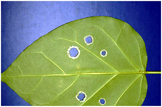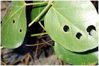 幼虫は葉の裏から円形に食べていきます。