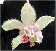- 8月、咲いた花をよく見てみよう。長い柄のある散形花序をつけます。がくは緑色で、5裂し細長いです。花冠は白くて5裂、それぞれが反りかえります。副花弁も5片よりなっています。めしべ、おしべは合体して ずい(蕊)柱をつくります。花粉塊を垂らします。