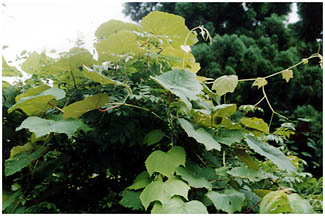 - 葉は五角形状で大きいです。長さは10−30cmです。