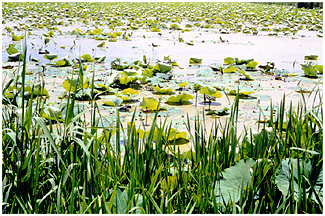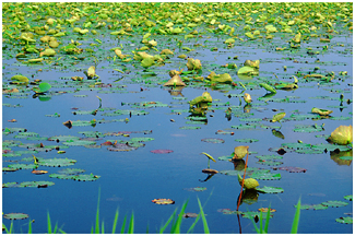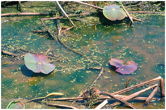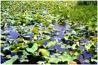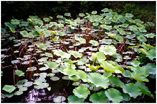 色のついた浮き葉で円形、たてがた、直径60cmです。