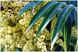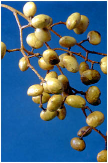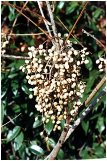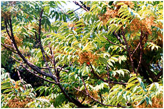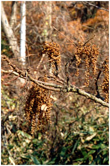 - 花は円錐花序で黄緑色の小さな花です。がくは5つに裂け、5個の花弁があります。雌雄異株で、おばなにはおしべ5本、めばなにはめしべが1本あります。