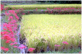 [イネの稔る田のあぜに咲く、北区山田町、2000.9.26.]