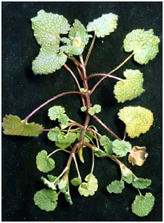 - 下部の葉には長い柄がつき、あらく鈍いきょ歯の葉をつけます。葉は半円形です。