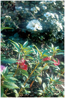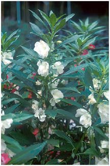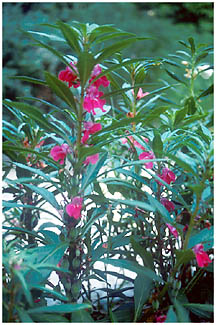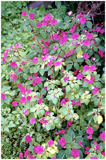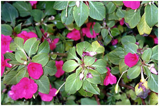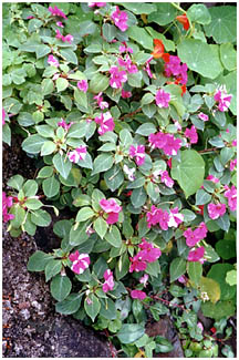 - 沖縄南部の谷筋には栽培したインパチェンスが飛び出て、花を咲かせています。