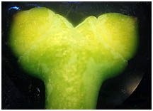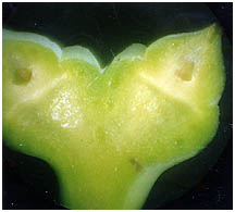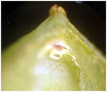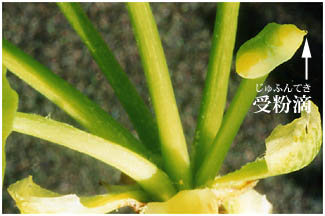 - めばなの先に水滴のようなもの(受粉滴)が見えます。花粉がつくように液を出します。