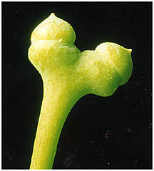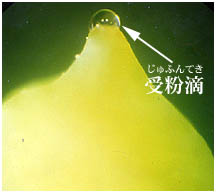 - 風で運ばれた花粉はめばなの胚珠から出された液にくっつきます。